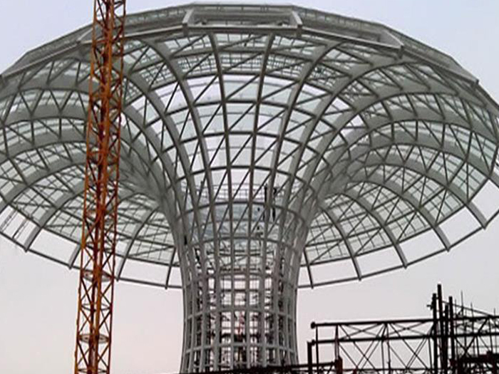 二、球形网架结构因其结构新颖,受力合理,自重轻、用钢量低等优点。如大型体育场馆球形津南螺栓球网架、公共场馆球形网架、电厂津南螺栓球网架、水泥工业球形网架、仓储物流球形网架、津南干煤棚工业球形网架、津南收费站津南加油站球形网架、展览中心、影剧院、商场、航站楼、候车厅、工厂津南车间、仓库、电视塔等球形螺栓球节点网架。国内球形网架结构主要分为:津南焊接球节点网架及螺栓球节点网架两种。螺栓球节点网架其构件工厂内加工量较大,现场安装便捷,适用于现场工期紧,津南施工条件、用电量受制约,网架形状复杂、津南杆件定位困难的异形结构。螺栓球节点球形网架系统基本由津南杆件、螺栓球、支撑支座等组成。按照节点形式可分为交叉津南桁架体系、四角锥体系、三角锥体系等。支撑方式多为固定支座支撑。对于大面积、大跨度及有特殊受力或伸缩要求的网架结构可采用橡胶支座、滑移支座、球铰支座等支撑形式,以满足结构自身的受力稳定、均衡,便于内力释放等设计要求。